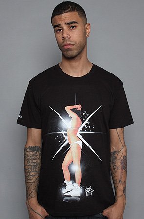 Jeepney The Premium Fit Shoe Shine Tee in Black,T-shirts for Men: Model is wearing a size MEDIUM The Premium Fit Shoe Shine Tee is made from 100% cotton and features a front print of a woman in a bikini and shoes with a star design behind her and there is a small Jeepney logo on the lower right sleeve. By Jeepney